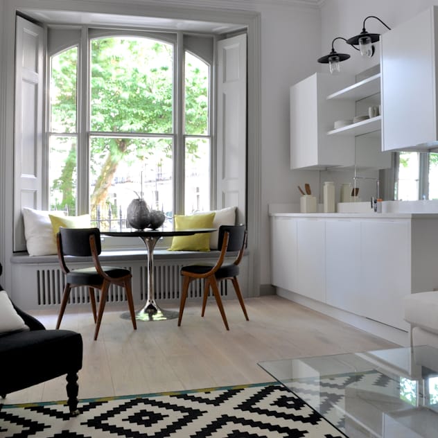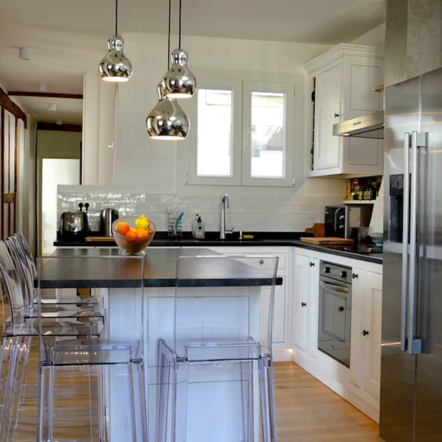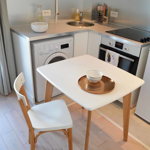 Corners might seem awkward at first, but they can be very useful when you know how to fill them with the appropriate furniture. The table in this beautiful L-shaped kitchen looks made to measure, and it fits into the space perfectly. it's the ideal place to drink a coffee in the morning before work, and can double up as a work surface when it's time to cook at night.